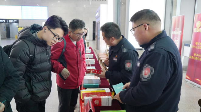 执法人员举起手中的卷烟样品现场介绍:“大家在车站便利店或任何店铺买烟时,一定要多看一眼——条盒上的32位激光喷码,特别是后几位数字,要和店里的烟草专卖零售许可证号对上,这才是从正规渠道进入市场的。”通过这种方式,工作人员将法律知识融入旅客旅途,让“12313”举报热线随着南来北往的人流传播到四面八方,真正实现了守护消费者权益“零距离”。
