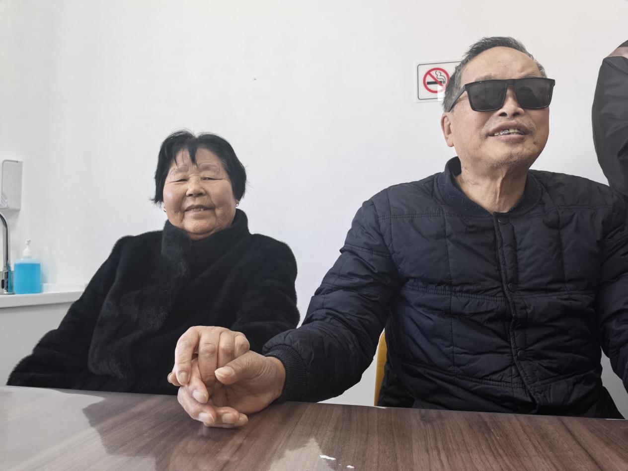 床尾,儿子儿媳孙女围坐一圈,轻声唠着家常。顾志清看不见,但他知道,老伴就在身边。这双手,他已经摸了近60年。