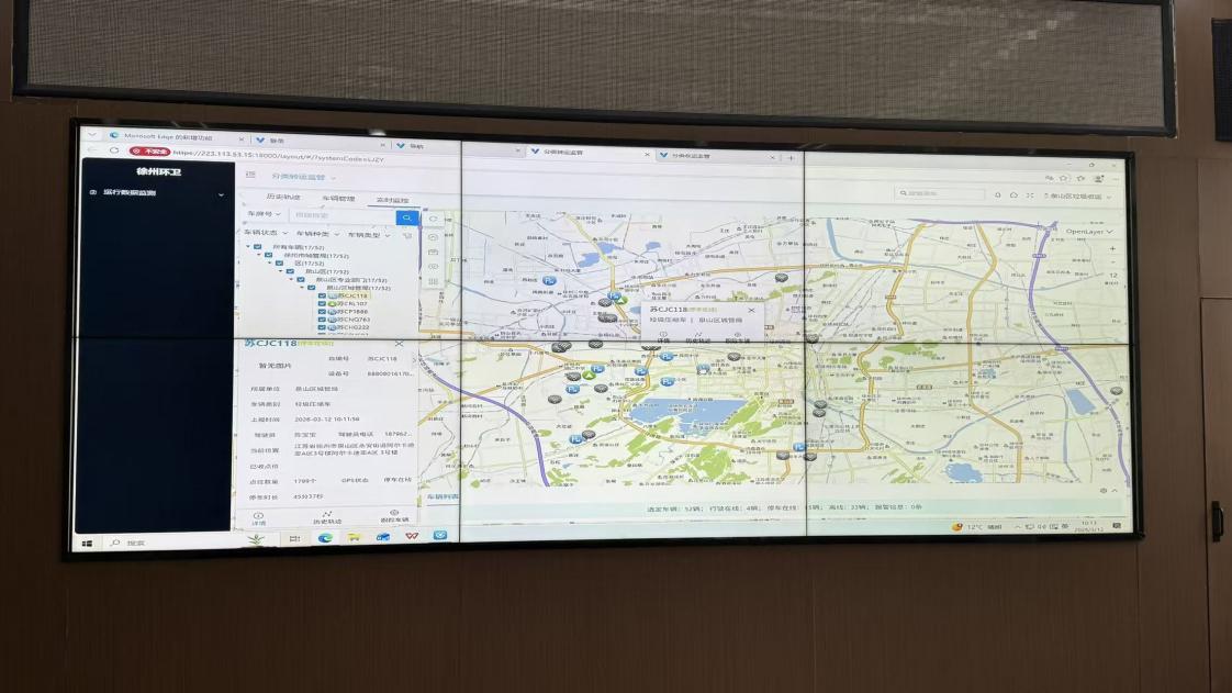 所有新能源车辆均已接入徐州市城市运行综合监管平台,配备北斗定位系统,实时监控车辆位置、行驶轨迹、作业状态等关键信息。泉山区城管局可通过智慧大屏对34辆收运车辆进行统一调度和管理,实现“定时间、定地点、定路线”的精准监管。