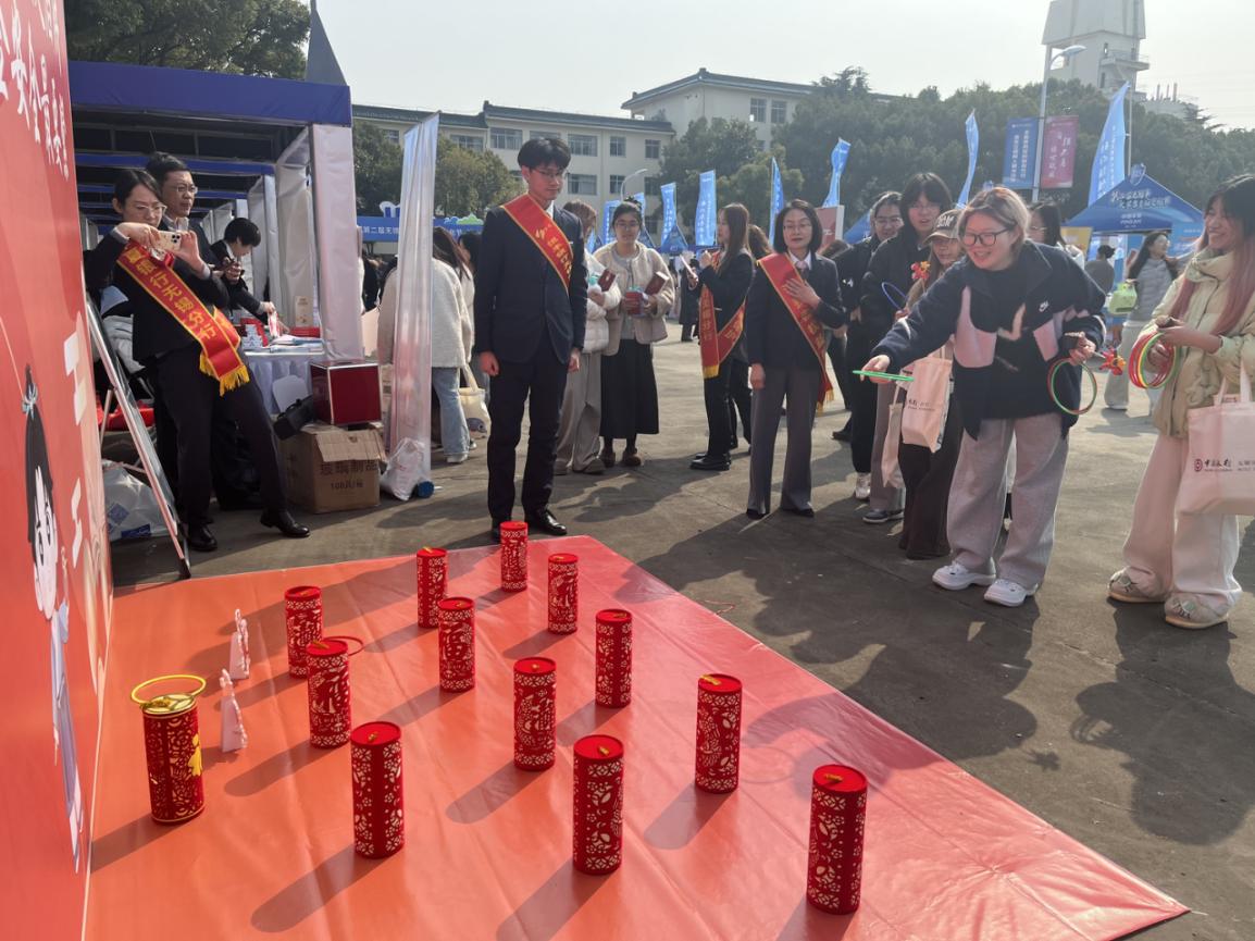 将金融知识从书本搬到操场,是本次文化节的一大亮点。在互动游戏区,恒丰银行负责的“欢乐套马”游戏成为“人气王”。游戏将“征信查询影响贷款吗”“如何识别理财风险”等知识点印制在目标桩上,学生通过套圈参与挑战,在欢声笑语中加深对金融概念的理解。工作人员适时补充讲解,将知识点延伸至现实生活,让抽象概念变得触手可及。此外,恒丰银行还协助组织了“赶马入栏”“马上遇惊喜”等多项互动游戏,将理性消费、反诈防骗等消保元素巧妙融入其中,真正实现“学中玩、玩中学”。