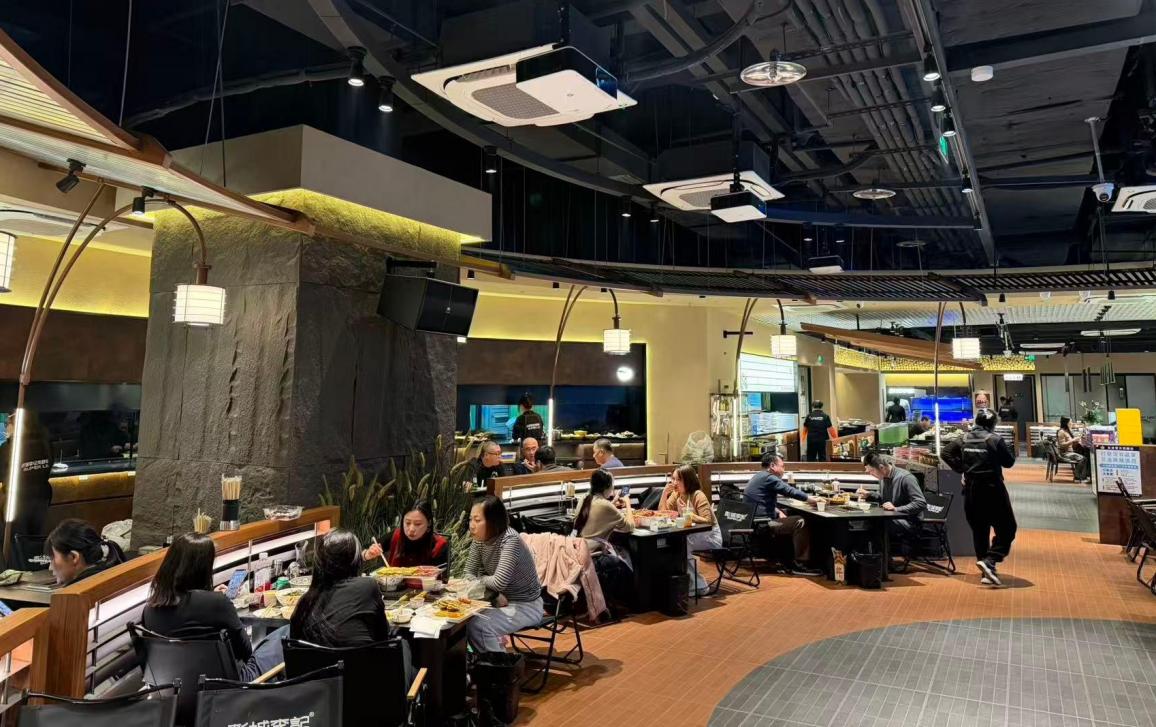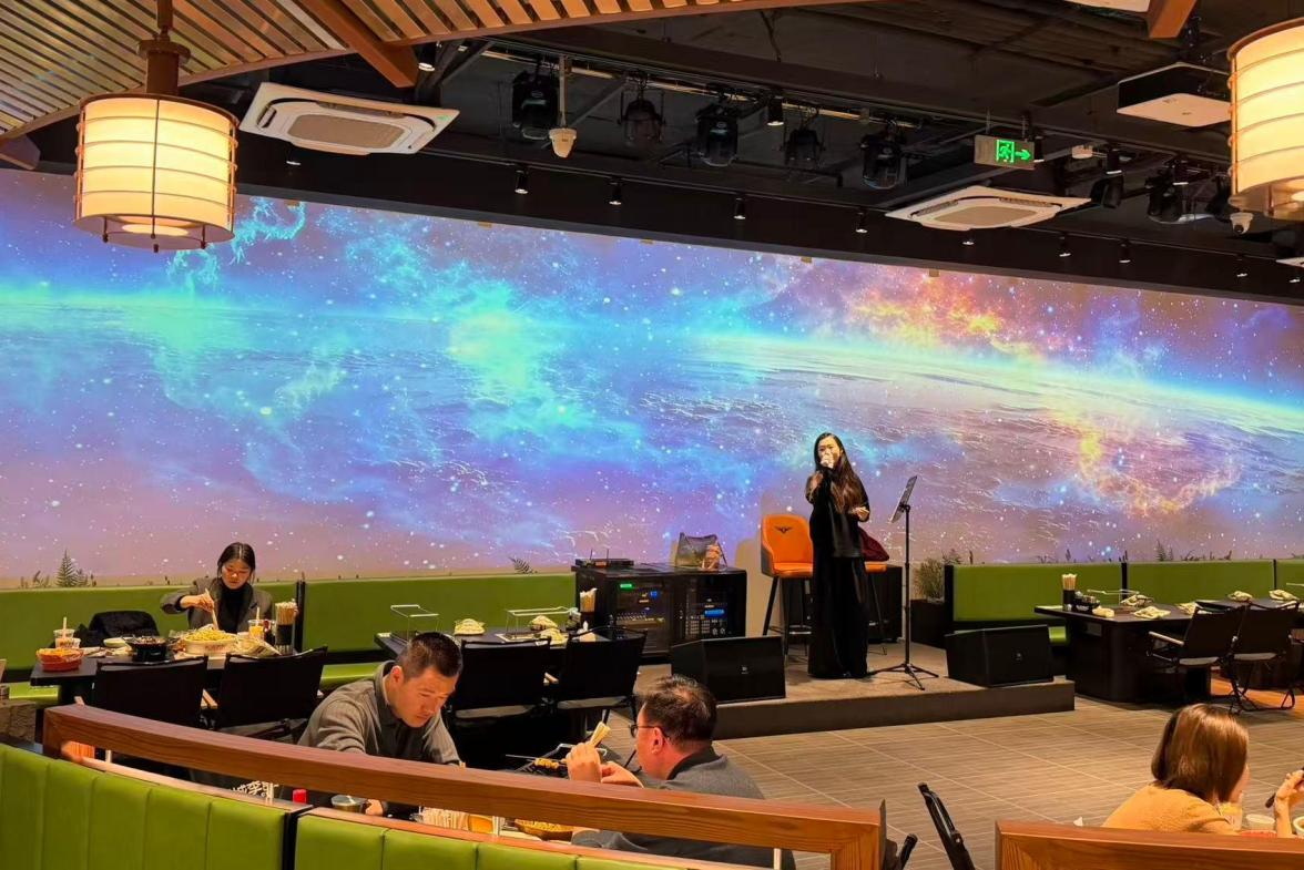2023年后,曾经积累的客源迅速转化为客流。老店经历两次扩店,面积从150平方米增至300平方米。在面对老店火爆的客流,以及徐州文旅市场不断攀升的热度,夫妻二人决定抓住商机。2025年,李敏和侍鹏在云龙万达商圈投资开设一家800平方米的二店。二店在保留老店传统口味的同时,融入了更多年轻人喜爱的潮流元素。更具户外露营风格的装修,每晚举办的室内演出,不仅为顾客营造了舒适的就餐氛围,还吸引了不少外地游客前来打卡拍照。新店最“吸睛”的是一块150平方米巨型投影,这一基于侍鹏个人足球兴趣的设施,恰好为承接“苏超”流量做足了硬件准备。