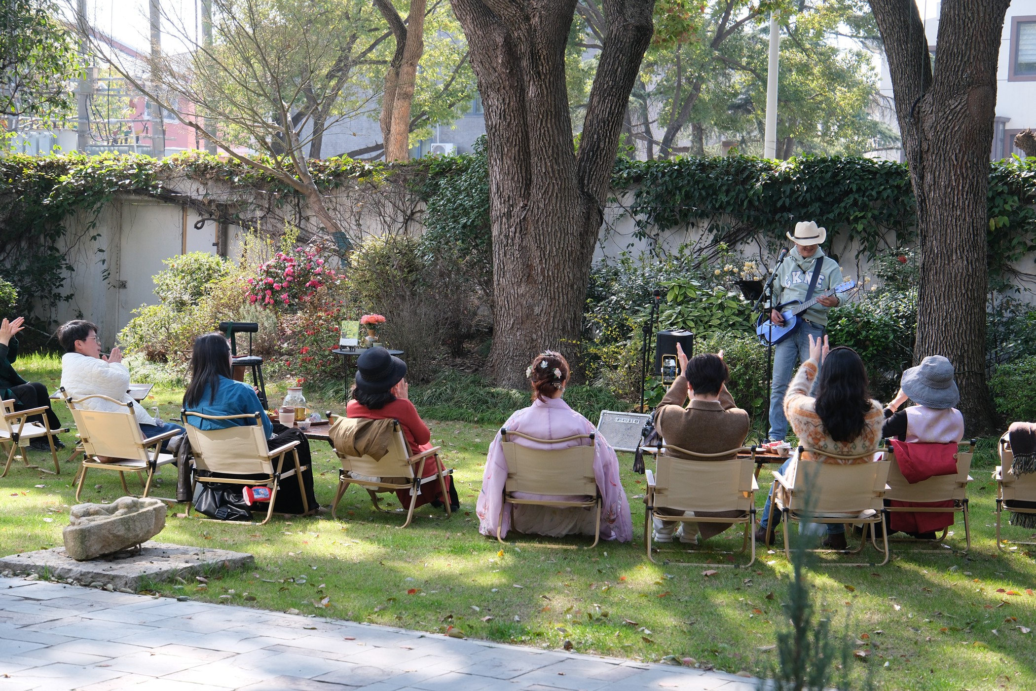 随着气温回暖,艺术空间馆的户外阅读场地迎来了最诗意的时光,数场别开生面的民谣诗歌会在此上演。独立书店主理人、民谣歌手与广大书友围坐一起,吟诵声、吉他声、清唱声与春风、鸟鸣交织,是写给春天的诗,也是唱给自己的礼物。二亩半钟书房负责人说道,春日是最有生机的季节,音乐与阅读也是最能赋予人生动灵魂的项目,二亩半希望成为爱书者的精神家园。
