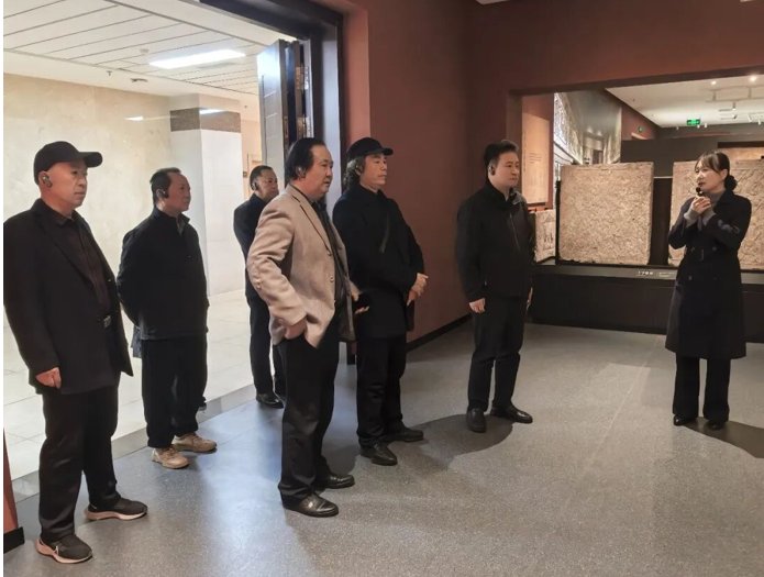 随后,翟优一行赴沛县博物馆开展深度交流,沛县文体广电旅游局党委书记、局长陈静,党委委员、副局长王海峰,博物馆馆长李莹莹等陪同。在讲解员引导下,一行人深入“青石镌史”“龙飞沛泽”等核心展厅,沉浸式体悟沛县千年历史底蕴与独特的汉文化基因。通过对馆藏汉画像石、大风歌牌等文物的细致品鉴,大家从乡土文脉中汲取了丰富的艺术创作灵感与养分。