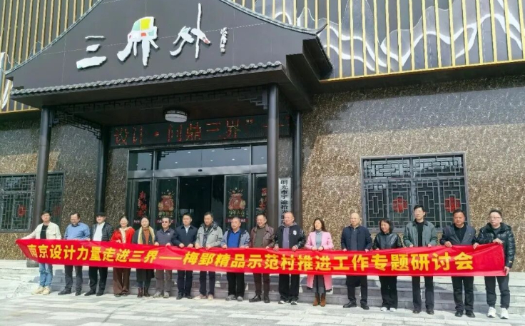 3月22日上午,南京市品牌家居商会设计师分会(南京设计力量)一行10余人来到安徽明光三界镇梅郢村,举办“南京设计·问鼎三界”梅郢村艺术推进工作专题研讨会。省城乡规划设计院副院长唐历敏、南京设计力量会长唐余雄、中外建南京设计院院长刘浅、中建设计研究院院长唐建军、苏邑建筑设计院院长韩晖、中设集团设计师管鸿翔,商会工会主席潘春淋及副会长刘红兵等参加。明光市政府副市长缪传凤、明光市文旅局局长王志谋、三界镇党委书记李振国、镇长赵贝贝、三界外艺术研究院院长沉浮等领导出席。