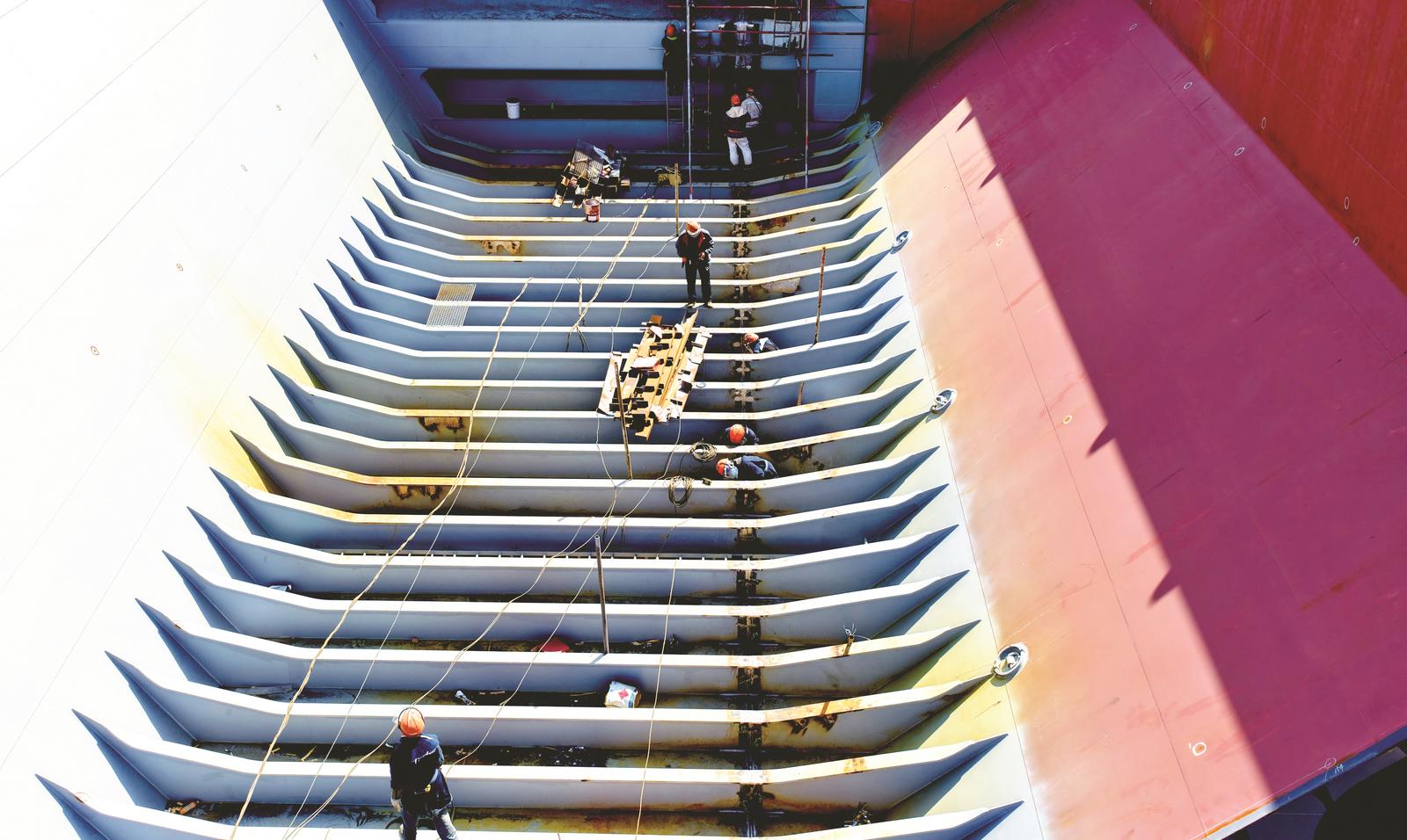 21日,在位于如皋市长江镇的江苏海通海洋工程装备有限公司,工人们正在赶制中外订单产品。据悉,该企业订单已经排至2029年,预计今年交付各型船舶19艘,年造船完工量突破100万载重吨。(许丛军)
