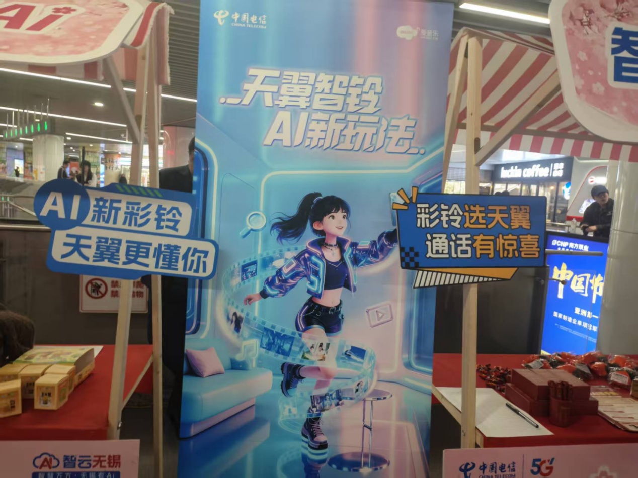 天翼智铃体验区展示电信AI智能视频彩铃,市民可设置樱花主题专属铃声。