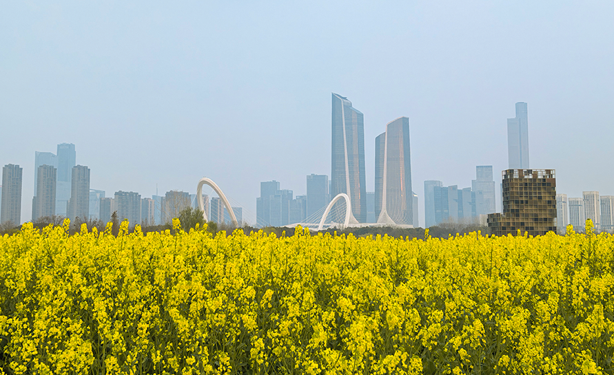 春日的江心洲金黄色油菜花肆意盛放,站在毛孩岛即可将南京眼、双子塔的摩登天际线尽收眼底。
