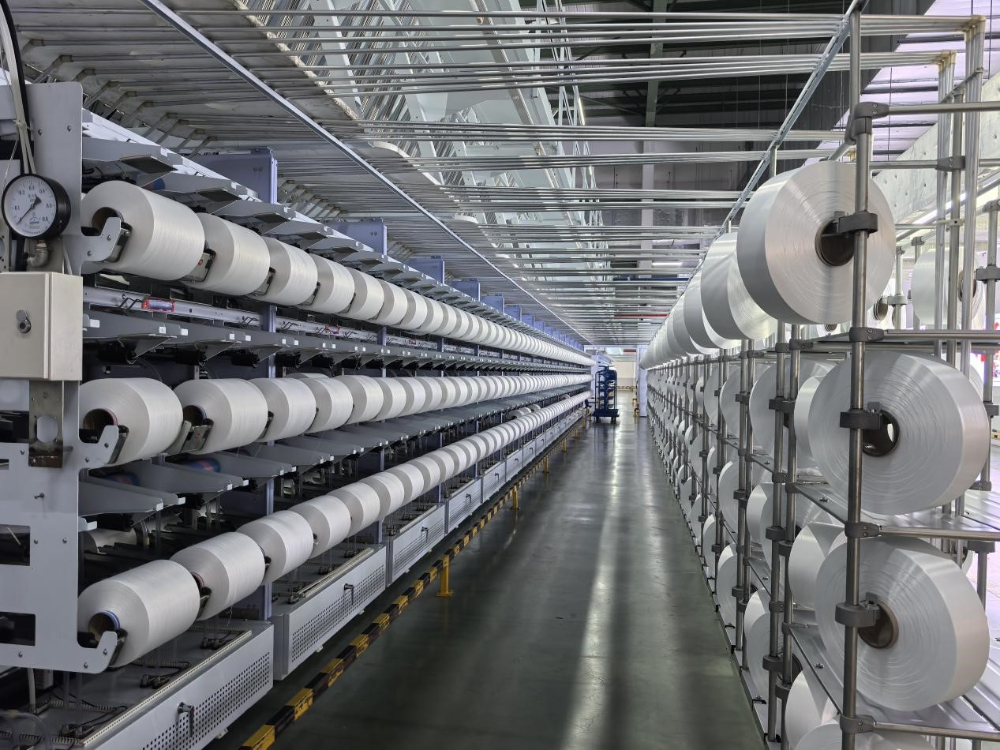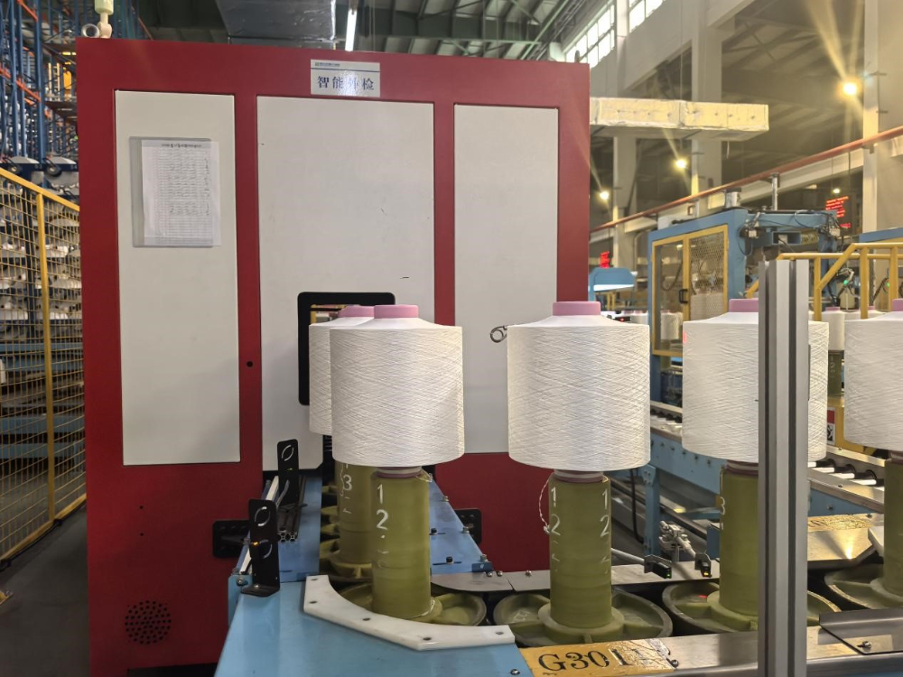 加弹三车间内,AGV小车、自动滚筒、智能检测、自动筛选、自动包装、无人运输,每一块光洁的丝饼自带“数字身份证”,从生产到出库全程可追溯。