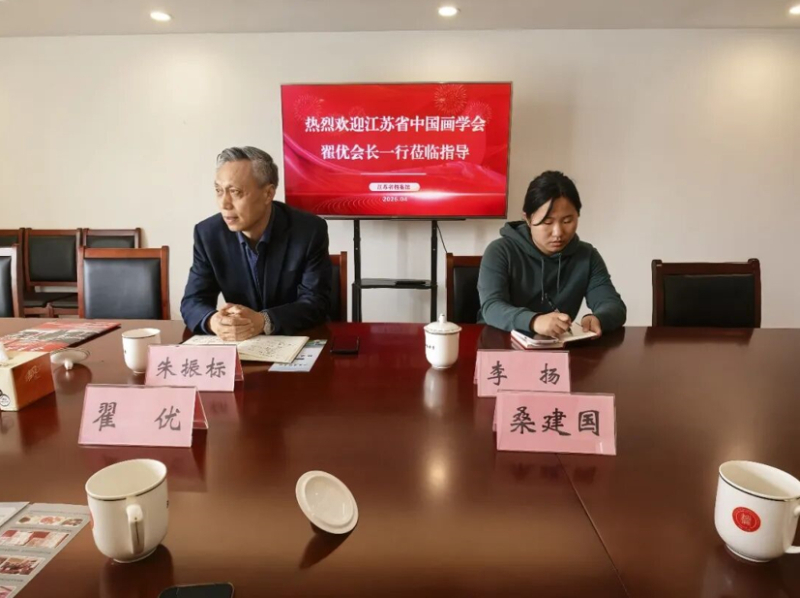 4月1日,中国画学会副秘书长、江苏省中国画学会会长翟优,学会党支部书记张广才,副会长桑建国、韩非一行,受邀前往江苏省档案馆开展交流参访活动。江苏省档案馆征集处处长朱振标热情接待到访一行,陪同参观并主持座谈交流,双方围绕“艺术存史、文化惠民、红色传承”核心议题展开深度研讨,共同探索艺术与档案事业融合发展的创新路径。