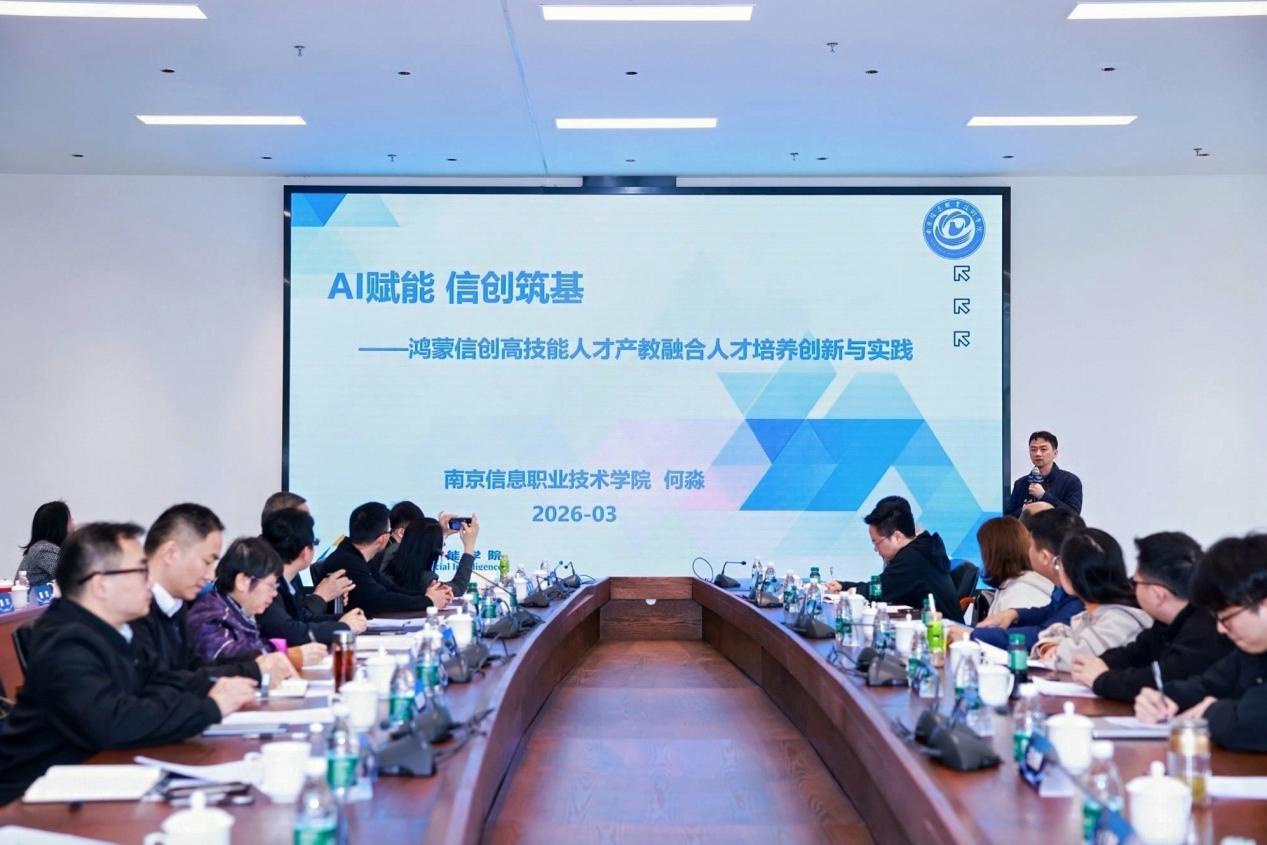 南京信息职业技术学院人工智能学院院长何淼作《鸿蒙人才培养实践》主题分享。学院在AI赋能、信创筑基的鸿蒙人才培养实践与探索中,紧扣信创产业万亿规模与人才缺口痛点,携手企业共建AI+信创产业学院,打造校企协同的产教融合创新模式。核心围绕“三阶段柔性长学制”探索,通过两年半试岗、半年顶岗、一年实岗的校企协同培养,将鸿蒙技术融入课程体系,打造实景实训场景。同时,以双师双导、引产入校为抓手,实现课程与产业需求同频,培养匹配鸿蒙生态需求的信创高技能人才,为产业自主可控输送力量,也为职业教育信创人才培养提供可复制的实践方案。