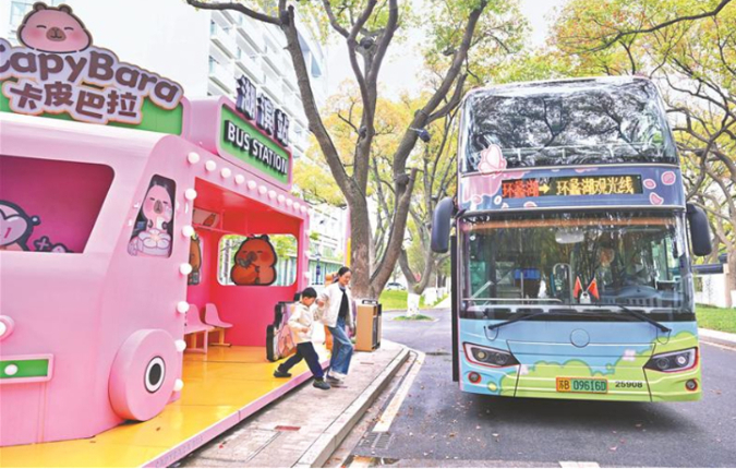 樱花掩映下,印着卡皮巴拉图案的主题双层巴士亮相环蠡湖线,吸引不少家长带着孩子前来打卡。一年级学生周珂锐的妈妈一早便带着孩子来体验。这条环蠡湖线路串联起渔父岛、渤公岛、蠡园、万象城等春游点位,一路湖景、花景相伴。“一天内可以反复乘坐,一个小时一班,我们到了一个景点先下来玩一会儿,再坐下一班继续走,不用一直赶路。”周珂锐妈妈说。“这次不只是换个外观,而是把整条线路当成一次春游体验来设计。”无锡公交锡巴士运务分公司产品研发部主管徐阳介绍,线路设计时充分考虑了亲子家庭的出行节奏,希望乘客能够按照自己的安排随走随停,把乘车过程本身也变成春游体验的一部分。(陈怡迪 文/李一芳 摄)