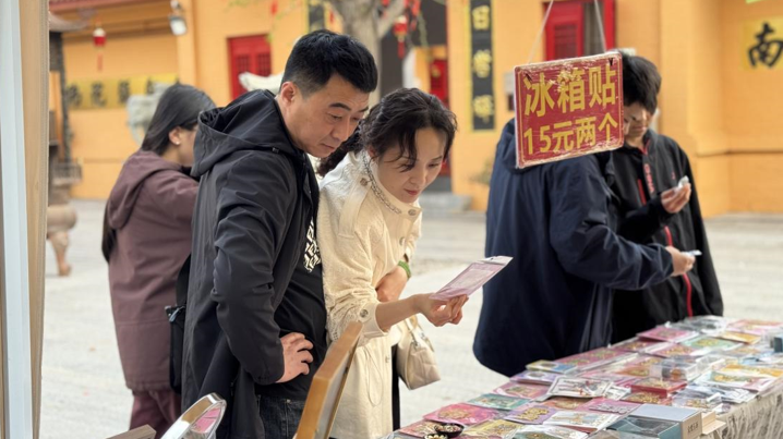 非遗编绳摊位前的木雕作品栩栩如生,宋锦挂坠精致典雅,摊主用一根根彩绳将木雕与彩绳巧妙编织,赋予每件作品独特的吉祥寓意。“绳结编法不同,寓意也不同,平安、如意、纳福……配上木雕,每一件都是独一无二的。”摊主笑着说。