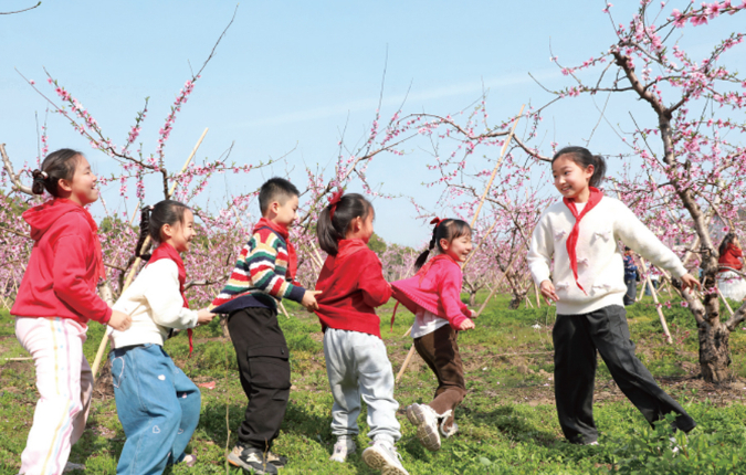 昨天是2026春假首日,不少学生趁着好天气,走进春天享受美好。图为在金顾山雪桃种植基地,不少小学生在桃树下嬉戏,现场一片欢声笑语。(张予希 黄惠刚 文/图)