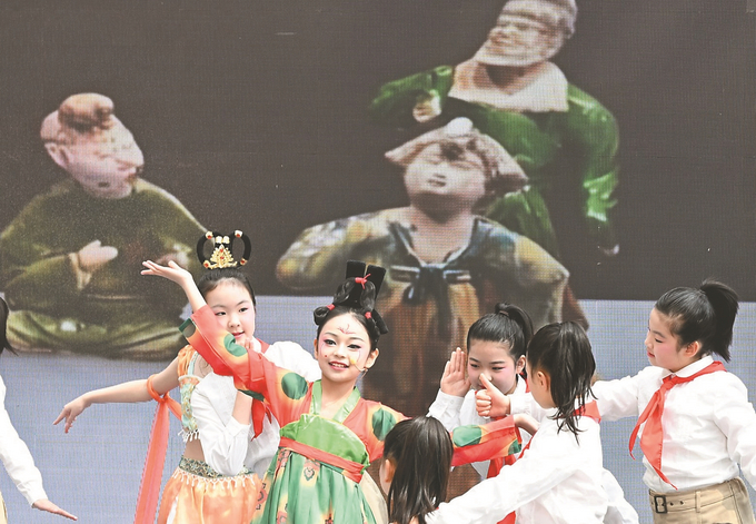 4月1日,身着汉服的青少年在南京市六朝博物馆体验“六朝茶礼”,参观展馆并开展研学活动,感受中华优秀传统文化,乐享首个春假。图为创意表演《文博奇妙Show》。本报记者 余萍 摄