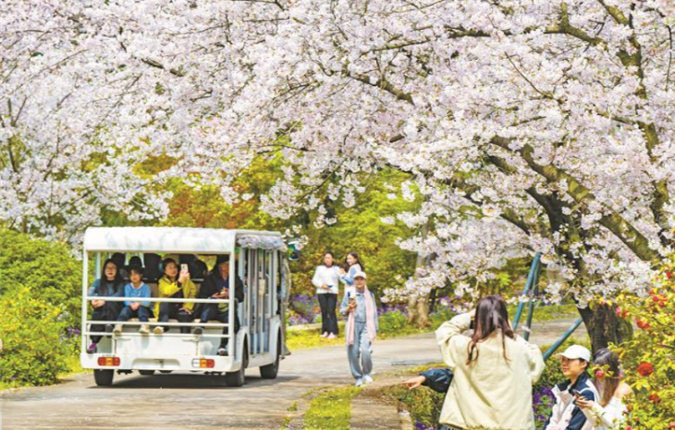 鼋头渚景区樱花已进入盛花期,目前每天游客约2万人次。图为昨天,游客在鼋头渚漕湾打卡。(宗晓东 摄)