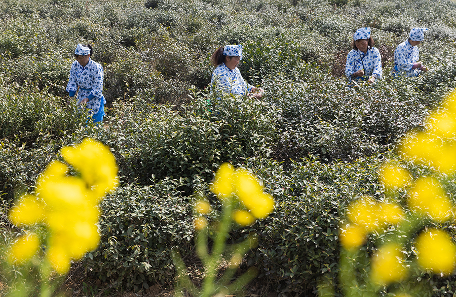 4月4日,茶农在盱眙县黄花塘镇雨山茶场采摘明前春茶。张绍军 摄