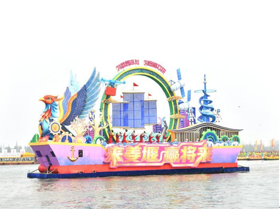 上午11时,会船表演正式开启,七条贡船依次向观礼台驶来,一船一主题、一船一内涵,融合现代科技,承载水乡文脉与时代愿景。率先出场的领航船“康养名城 活力姜堰”迅速成为全场焦点,紧随其后分别是“风调雨顺 国泰民安”“骐骥驰骋 福禄祯祥”“勤来溱湖 养生养福”“梦回溱湖湾 爱在鹊仙岛”“奋楫争先 立篙潮头”“来姜堰 赢将来”,以此传递对福寿安康、爱情美满、学业有成、事业兴旺的美好愿景。每条贡船驶过,现场观众报以阵阵掌声。