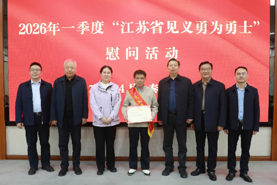 近日,江苏省见义勇为基金会相关负责同志前往泰兴市黄桥镇,为获评2026年第一季度“江苏省见义勇为勇士”的吴建东送上奖证和关怀,高度赞誉其危急时刻挺身而出、勇救落水群众的英勇壮举,向这位平民英雄致以崇高敬意和诚挚慰问。