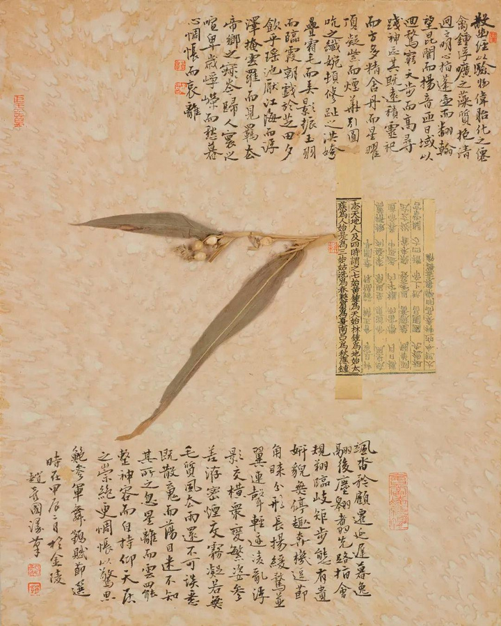 展览中,一组名为“素心集物·草木状”的作品尤为引人注目,干枯的植物标本与鲜活的笔墨相映成趣,形成了一种奇妙的对话。赵彦国说,这些植物标本源自一次逛旧书店的偶然发现,店主告诉他,它们源自20世纪五六十年代南京一位植物学教授的采集,承载着其毕生心力,但他过世之后,却在岁月更迭中险些沦为“垃圾”。
