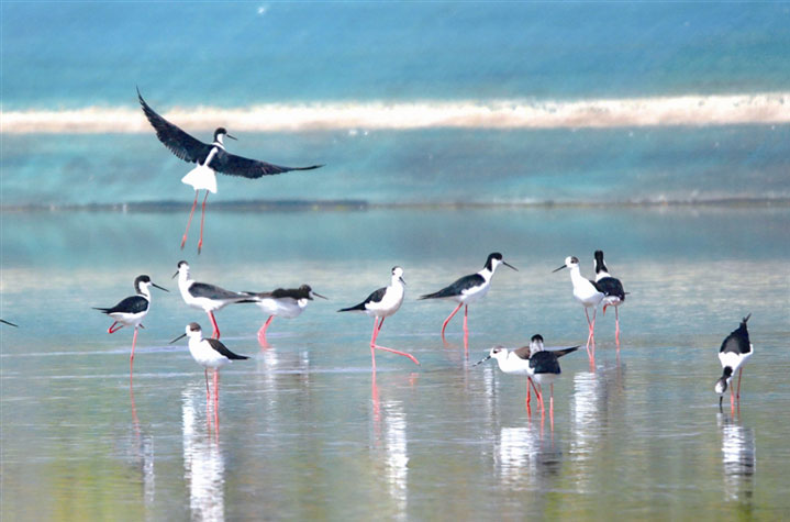 图为栖息在赤岸村藕塘湿地的黑翅长脚鹬。(黄惠刚 摄)