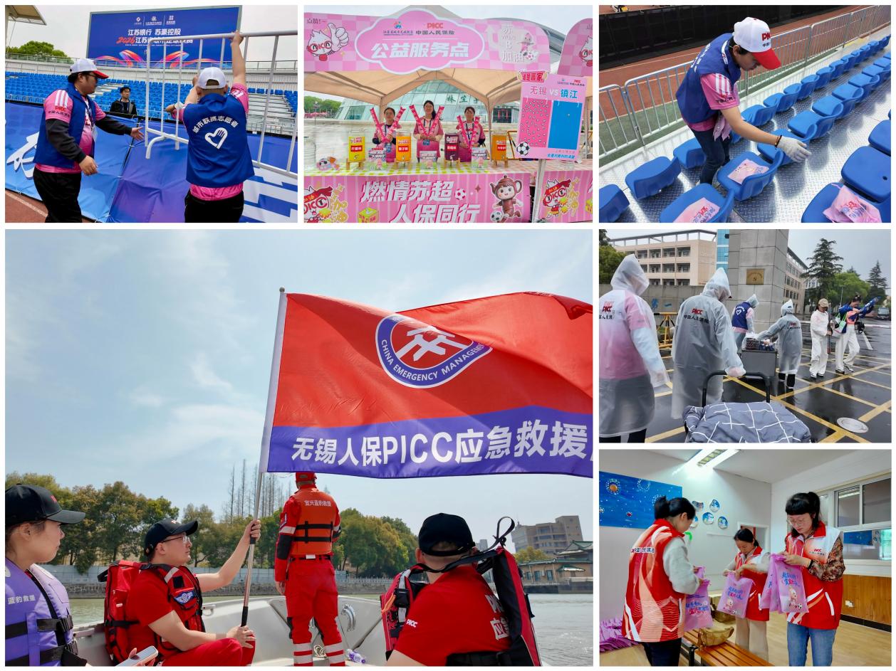 赛时,人保财险无锡市分公司党员先锋队化身多重角色:在公益展棚,他们是温暖传递者,为球迷送上饮水与助威道具,同步开展保险知识普及、反诈宣传与消保教育;在看台沿线,他们是文明守望者,维持秩序、疏导人流、答疑解惑;在应急点位,他们是“安全守护神”,实施水陆立体巡查,全天候备勤值守。通过“党建+服务”的深度融合,让党旗在绿茵场上高高飘扬。