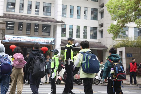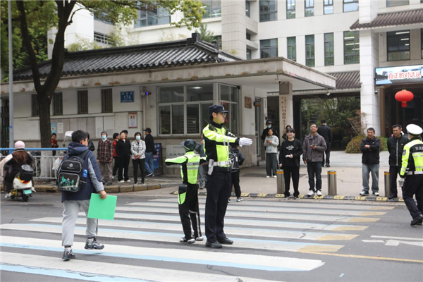 智能机器人身着反光执勤服,在路口引导车辆、行人通行。同时,它搭载智能语音播报系统,实时提醒接送车辆即停即走、有序停靠,提醒学生注意来往车辆、安全过马路,全程协助民警维持高峰时段通行秩序,成为护学岗上不知疲倦的“得力助手”。