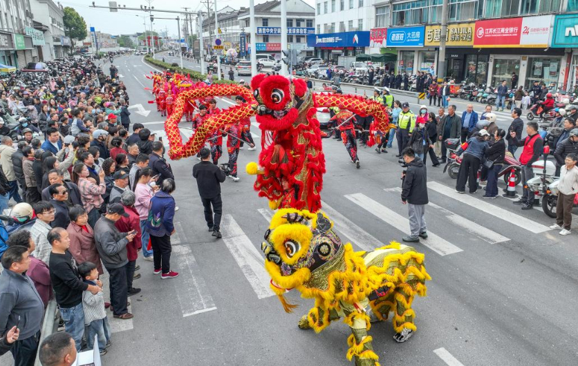 这也是一场民俗韵味与现代活力双向奔赴的民俗文化市集。4月18日上午9:30,一支舞龙舞狮队在锣鼓声中从孤山镇望江社区出发,一路欢腾行至孤山脚下,市民游客纷纷驻足拍照记录。此次市集特地设置民俗巡游、国风乐器演奏、非遗杂技表演,复刻传统庙会经典,同时融入机器人展演、流行音乐会等潮流元素,以及小丑互动、儿童剧表演等,让不同年龄段游客都能乐在其中。“得知这里正在举办‘三月三’活动,我便和和几个朋友相约前来游玩,既购买了靖江当地的特色美食,还看到了很多表演。”谈及感受,来自泰兴的游客唐明连连点赞。