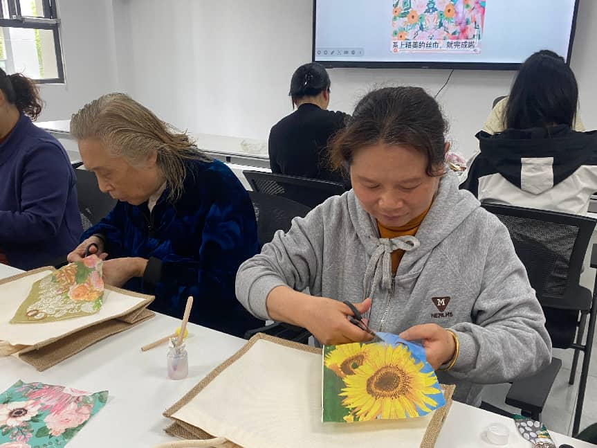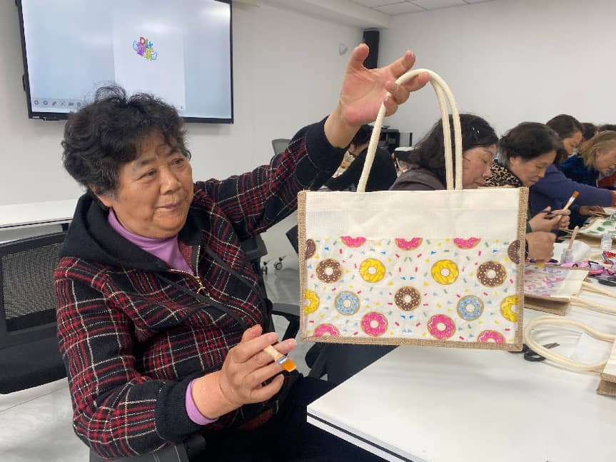 在轻松欢乐的氛围中,环保袋DIY创作环节正式开启。居民们有序领取麻布袋、颜料、画笔等创作材料,围绕“珍爱自然资源守护美丽中国”核心主题尽情创意创作。大家提笔勾勒、精心填色、巧手剪裁,充分发挥想象力与创造力,将绿水青山、花草万物等美好生态图景绘于布袋之上。一笔一画皆是心意,一裁一绘尽显初心,原本朴素空白的环保布袋,在居民们的巧手下焕然一新,变成了一幅幅色彩鲜活、创意十足的环保艺术作品。