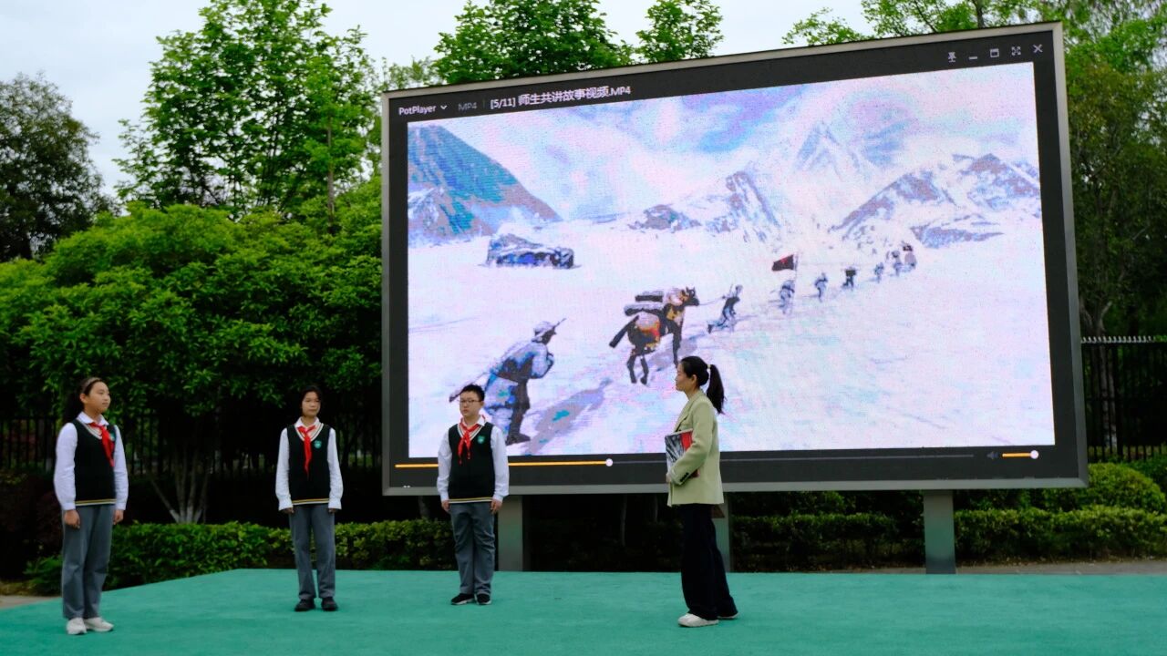 开幕式上,师生代表深情讲述《雪山上的军需处长》故事,字字铿锵,直抵人心;AI创意作品,同学们用数字技术重现“飞夺泸定桥”“爬雪山过草地”等场景,巧思与科技碰撞出独特火花;《红帆少年志,长征精神魂》的表演更是将现场气氛推向高潮,少年们用歌伴舞礼赞伟大长征精神。