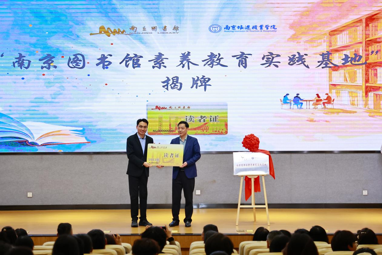 馆校协同,共建素养教育高地。启动仪式现场,南京图书馆副馆长黄世刚与学院副院长张骏共同为“南京图书馆素养教育实践基地”揭牌,并赠送5943张读者证。黄世刚表示,将深化馆校合作,共筑阅读阵地,共推文旅产业与文化教育的深度融合。这标志着双方在资源共享、服务互通、人才共育方面迎来里程碑式进展,以馆校协同的强大合力,为师生搭建更广域、多层次的阅读成长平台。