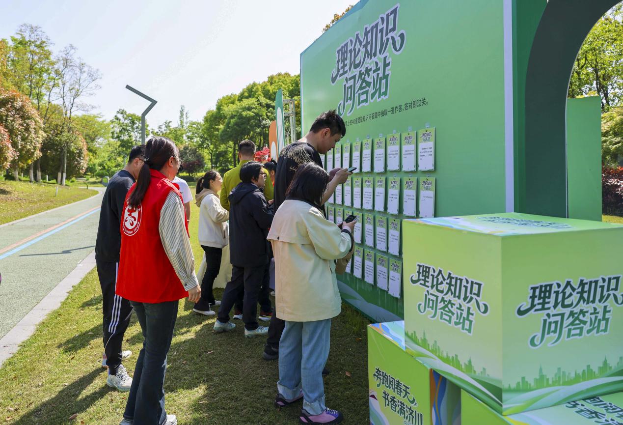 环湖健跑沿途精心布设五处特色打卡点位,将理论知识、文学常识、健康科普与趣味挑战巧妙结合。政策知识问答、头顶书本平衡挑战、趣味文学答题、创意书海拼图等多样化任务,取代了常规打卡模式,让参与者在迈步前行中动脑思考、趣味答题,一步一景品书香,一动一静学知识。