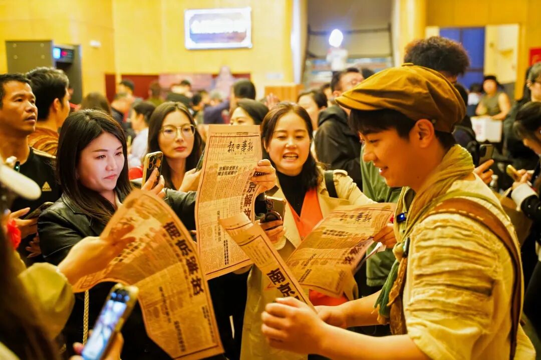 演出启幕前,众多观众便早早抵达现场,提前感受沉浸式演出的独特魅力。南京人民大会堂内精心打造的实景氛围,彻底打破观众与舞台的隔阂,报童清脆的叫卖声、市井摊贩的吆喝声、远方隐约的炮火声交织回荡,步入剧场,便瞬间穿越至1949年的南京城,每一位观众都从旁观者变为历史的“亲历者”。