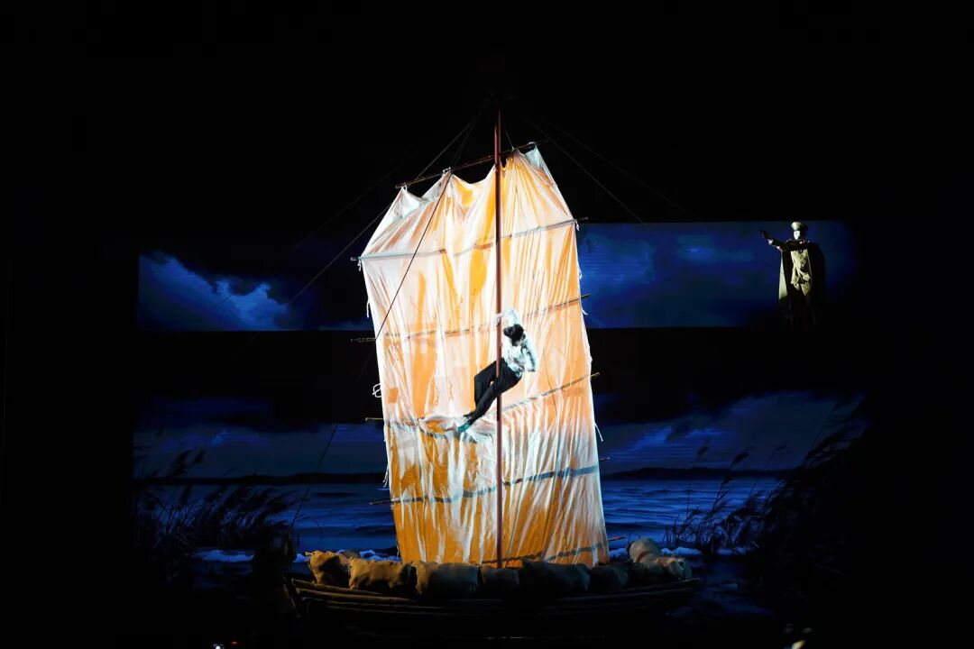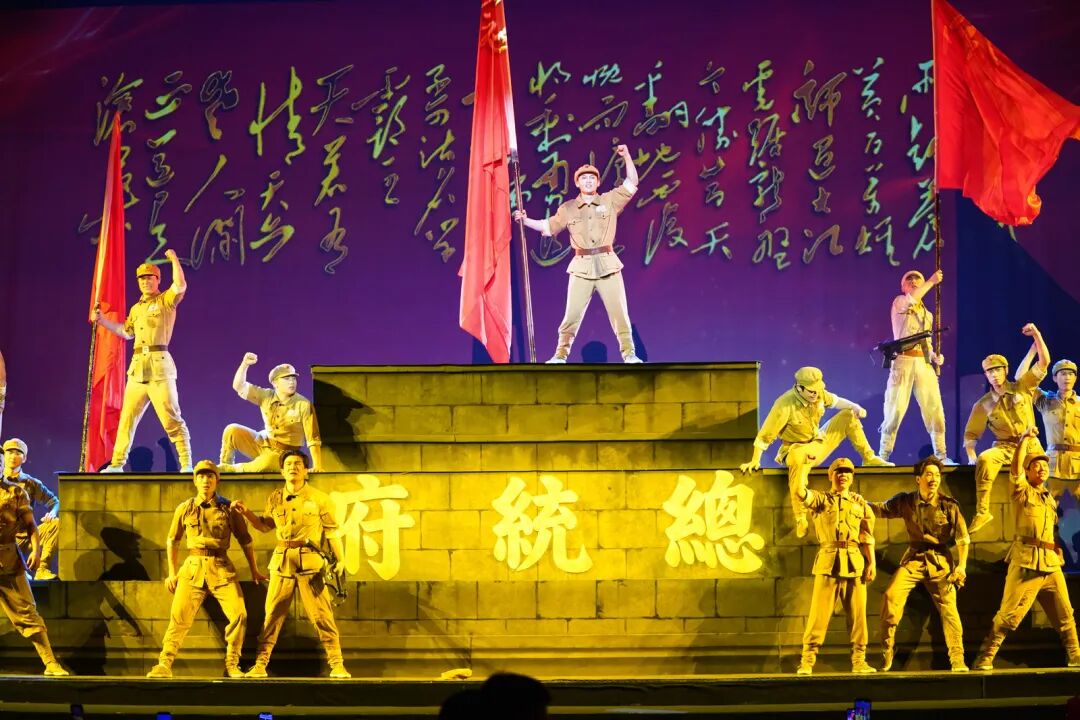 舞台之上,演员身姿矫健、凌空腾跃,杂技绳索灵动翻飞如银蛇舞动,配合沉浸式场景营造,渡江战役的烽火硝烟仿佛跨越时空扑面而来,将观众带回那段波澜壮阔的革命征程。当鲜艳的红旗稳稳插上“总统府”门楼的瞬间,全场观众热血沸腾、掌声雷动,不少人热泪盈眶,沉浸式感受革命胜利的荣光与不易。