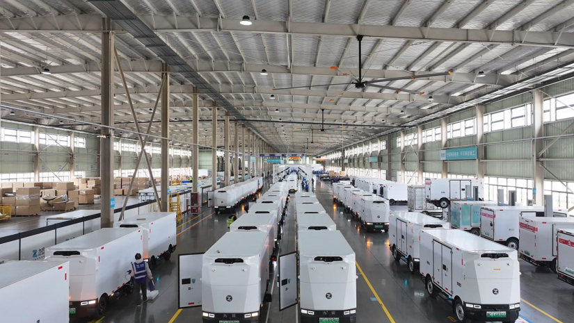在国邮智配(淮安)智能科技有限公司生产车间内,一派忙碌而有序的景象。一辆辆搭载全栈自研自动驾驶技术的L4级无人配送车整齐排列,正等待路面实况测试,即将奔赴城市配送一线。这些无人配送车凭借厘米级感知精度、24小时不间断作业能力,无需安全员值守,可自主完成避障、路线规划、停靠装卸等全流程操作,让城市物流配送更智能、更高效、更绿色,成为淮阴区智慧物流发展的生动缩影。