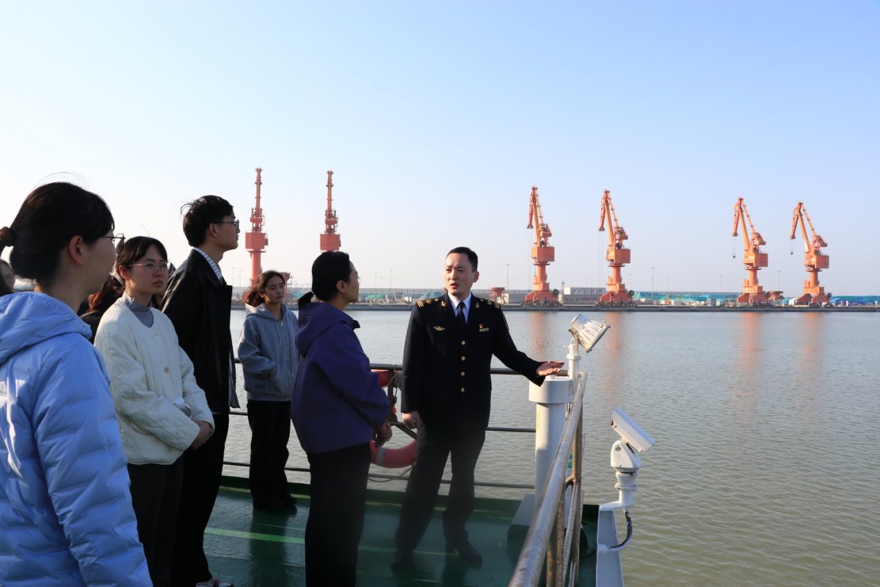 期间,团员青年们走进国家电投煤炭码头,近距离感受国家级一类口岸的发展脉搏与大国工程的磅礴气势。滨海港作为江苏沿海水深条件最优岸段之一,国电投码头位于滨海港区南港池,共建有4个煤炭专用泊位,最大靠泊等级达10万吨级,设计年吞吐能力3900万吨,是华东地区重要的能源储运枢纽。大家沿着码头廊道实地察看大型装卸设备和智能化堆场,认真聆听负责人关于港口规划建设、安全生产、绿色低碳运营的介绍,详细了解了煤炭接卸、仓储、转运全链条作业流程,真切感受我国港口建设实力与能源保供担当,坚定了立足执法岗位、护航港口发展的信念。