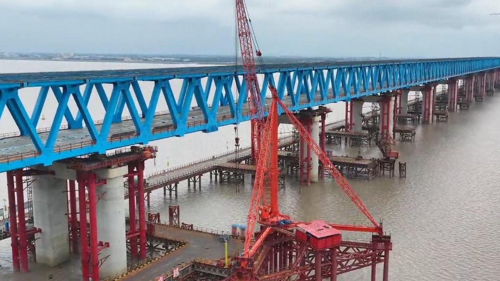 江苏启东:崇启公铁长江大桥双主塔同日封顶