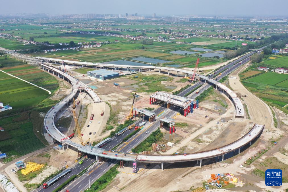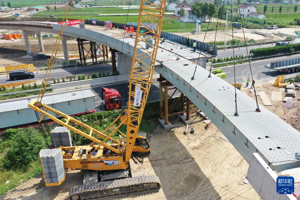 9月8日在江苏省东台市拍摄的东兴高速上跨G15沈海高速架梁作业现场(无人机照片)。