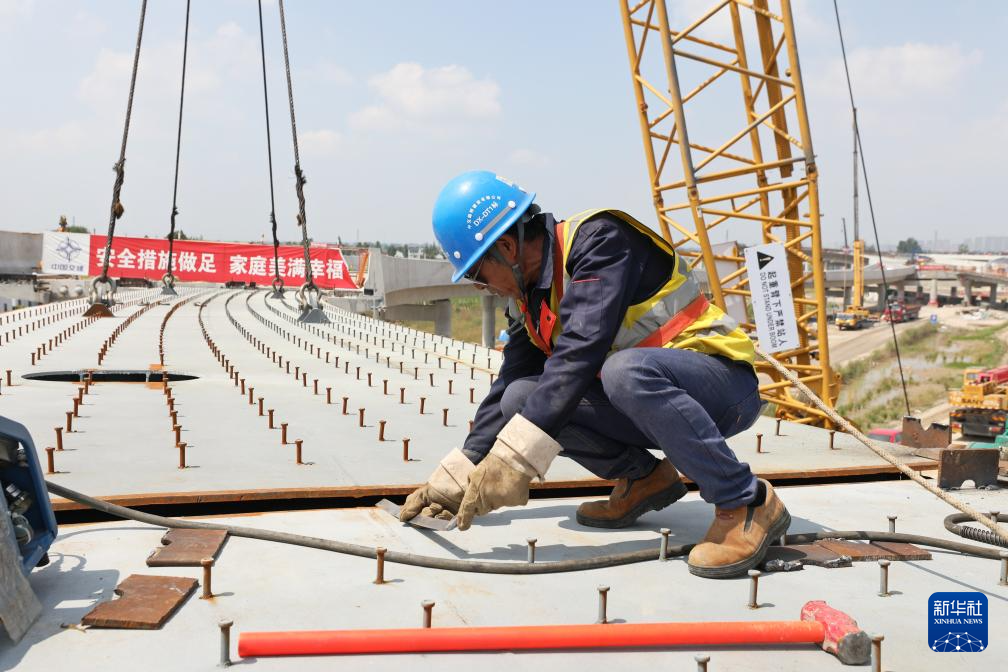 9月8日,在位于江苏省东台市的东兴高速上跨G15沈海高速架梁作业现场,工人在进行定位作业。