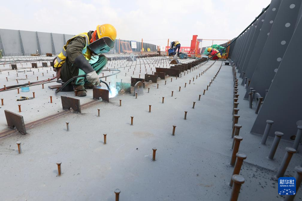 9月8日,在位于江苏省东台市的东兴高速上跨G15沈海高速架梁作业现场,工人在进行焊接作业。