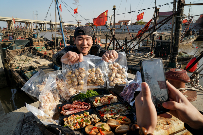 顾峻豪在江苏省连云港市赣榆区朱蓬口渔港拍摄短视频推销海产品