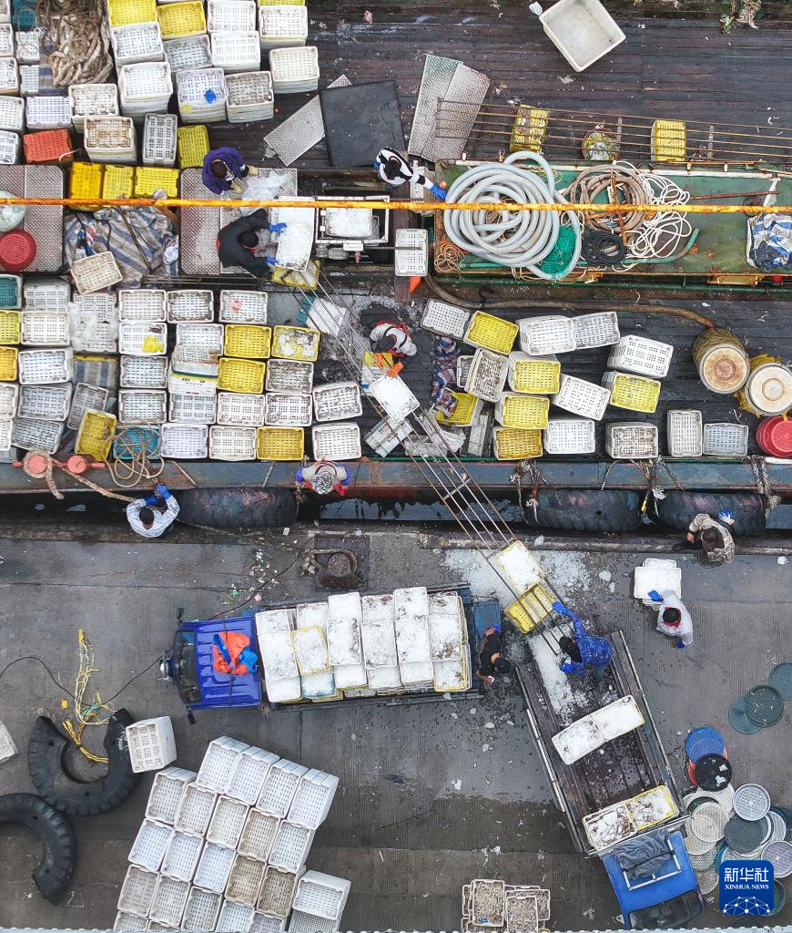 11月10日,渔民在启东吕四渔港码头卸运到港的海产品(无人机照片)。