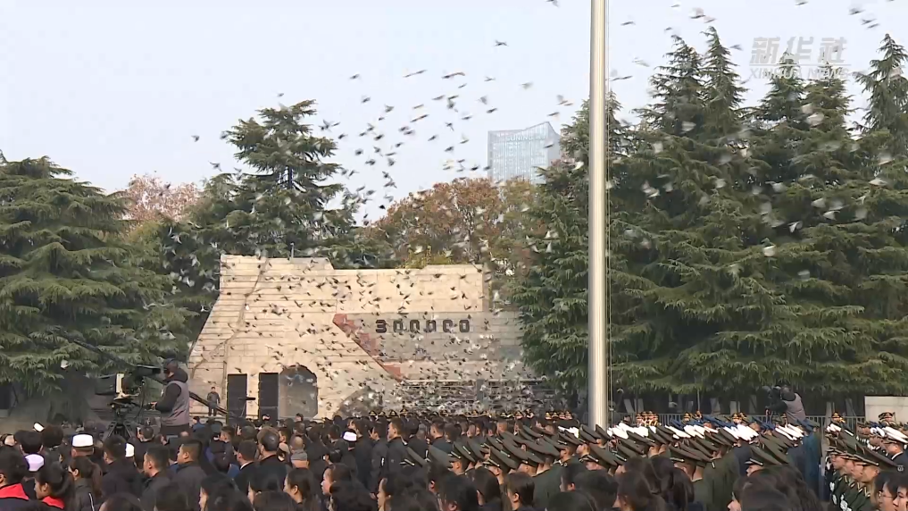 87名南京市青少年代表宣读《和平宣言》,6名社会各界代表撞响“和平大钟”。伴随着3声深沉的钟声,3000只和平鸽展翅高飞,寄托着对死难者的无尽哀思和对世界和平的无限期许。