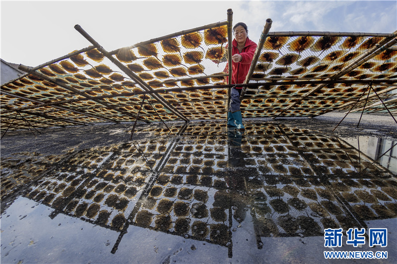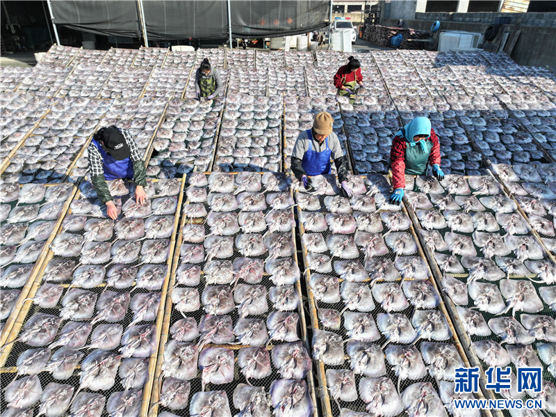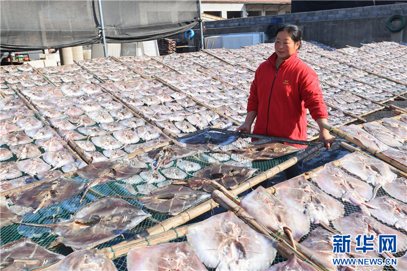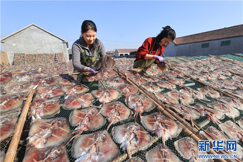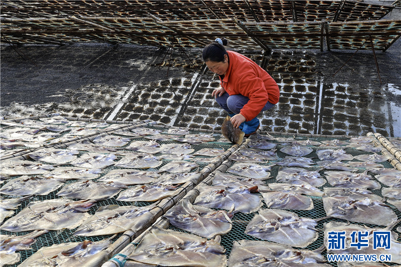 冬日,江苏省连云港市赣榆区柘汪镇马站村的渔民利用晴好天气晾晒鱼干。这些传统风味的土特产通过网络订单畅销全国各地,助力渔民增收。(王玥 司伟 匡立冬)