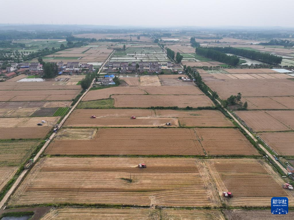 在盱眙县种粮大户刘凯的承包田,农机手驾驶收割机抢收小麦(5月27日摄,无人机照片)。