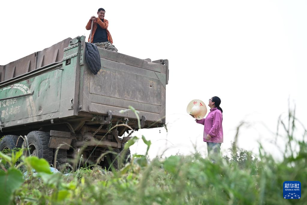 5月27日,盱眙县种粮大户刘凯在田间装运收获的小麦。