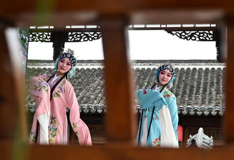 演员在盐城市的淮剧小镇为游人表演淮剧(2025年6月7日摄) 季春鹏摄