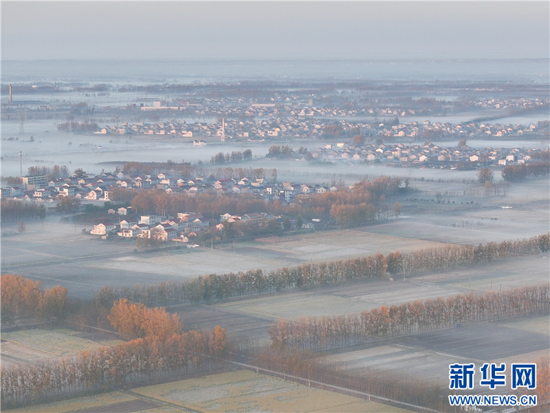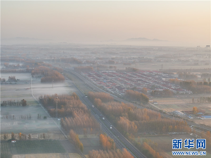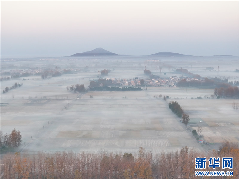 11月12日,连云港市赣榆区出现平流雾景观,晨雾笼罩着村庄,如梦如幻。(司伟)