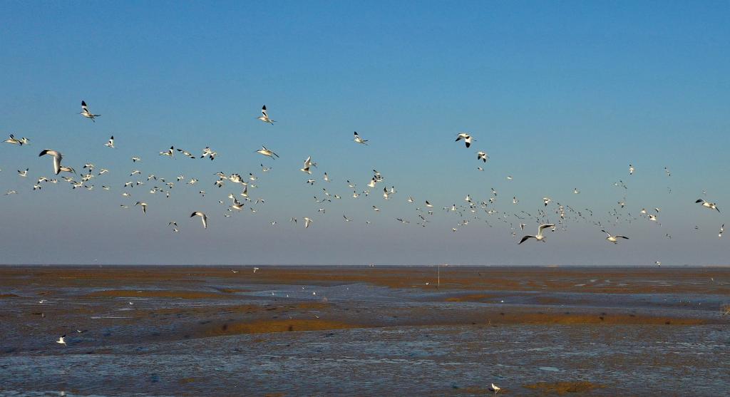 近日,江苏如东东凌滩涂湿地,成群候鸟舒展羽翼,旋舞于滩涂之上,与波光粼粼的水面相映,为冬日滩涂注入鲜活生机,勾勒出自然灵动的生态画卷。(顾华 摄)