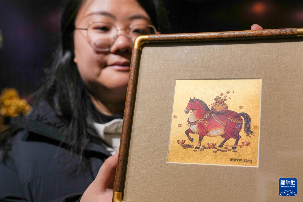 临近马年春节,南京金箔锻制技艺推陈出新,将生肖马元素融入创作之中。在南京金陵金箔集团股份有限公司的大师工作室内,国家级非遗传承人葛才金和团队共同设计打造以“骏马迎春”为主题的金箔系列产品。金片在指尖与纸间轻盈流转,经过贴金、塑形等多重工艺,一匹匹金光熠熠、姿态昂扬的骏马渐渐浮现,寓意“马到成功”“一马当先”,为新春注入吉祥韵味。