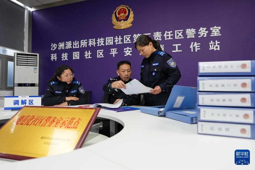 1月8日,在南京市公安局建邺分局沙洲派出所科技园社区警务室,民警赵阳(中)和同事交流当日工作。